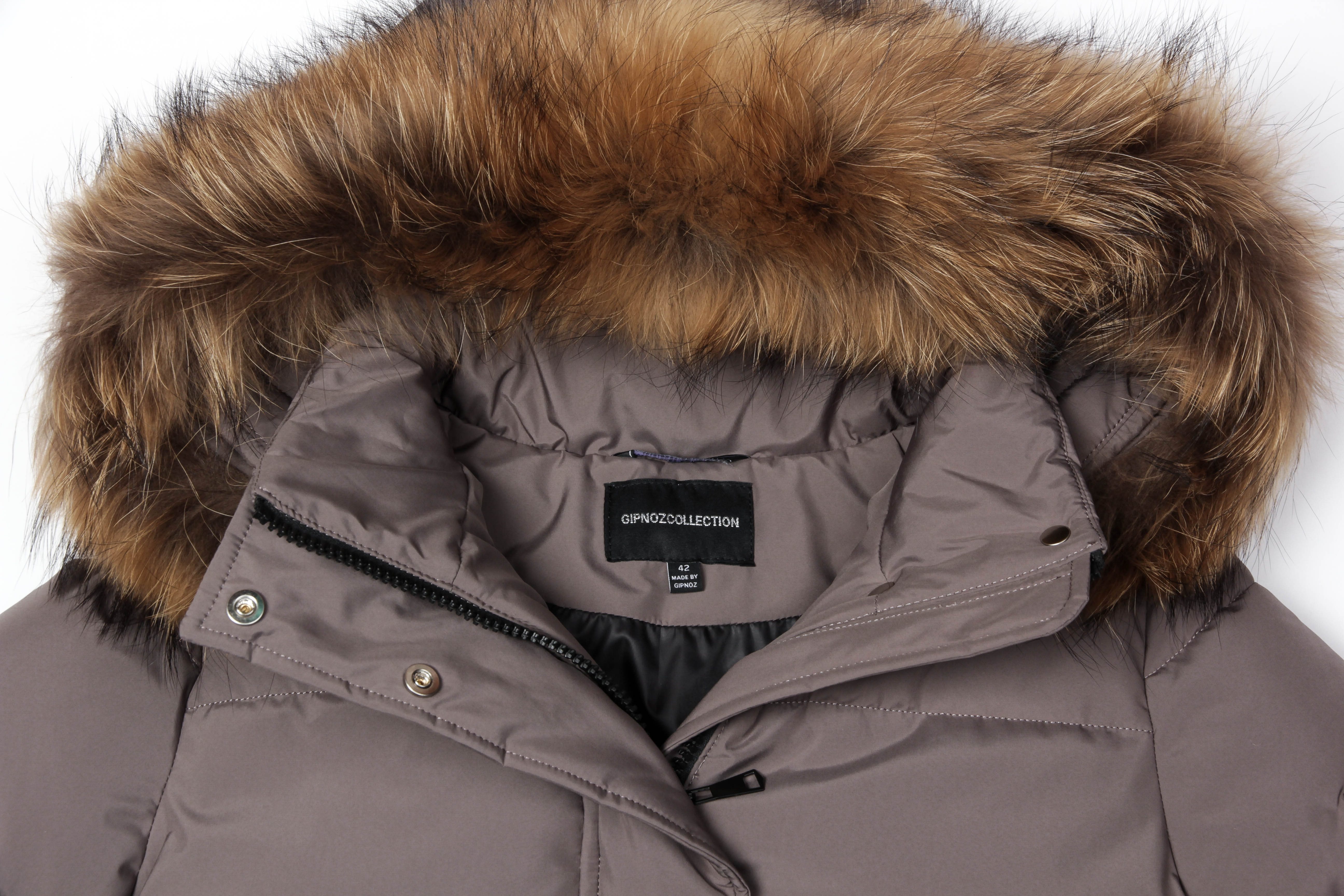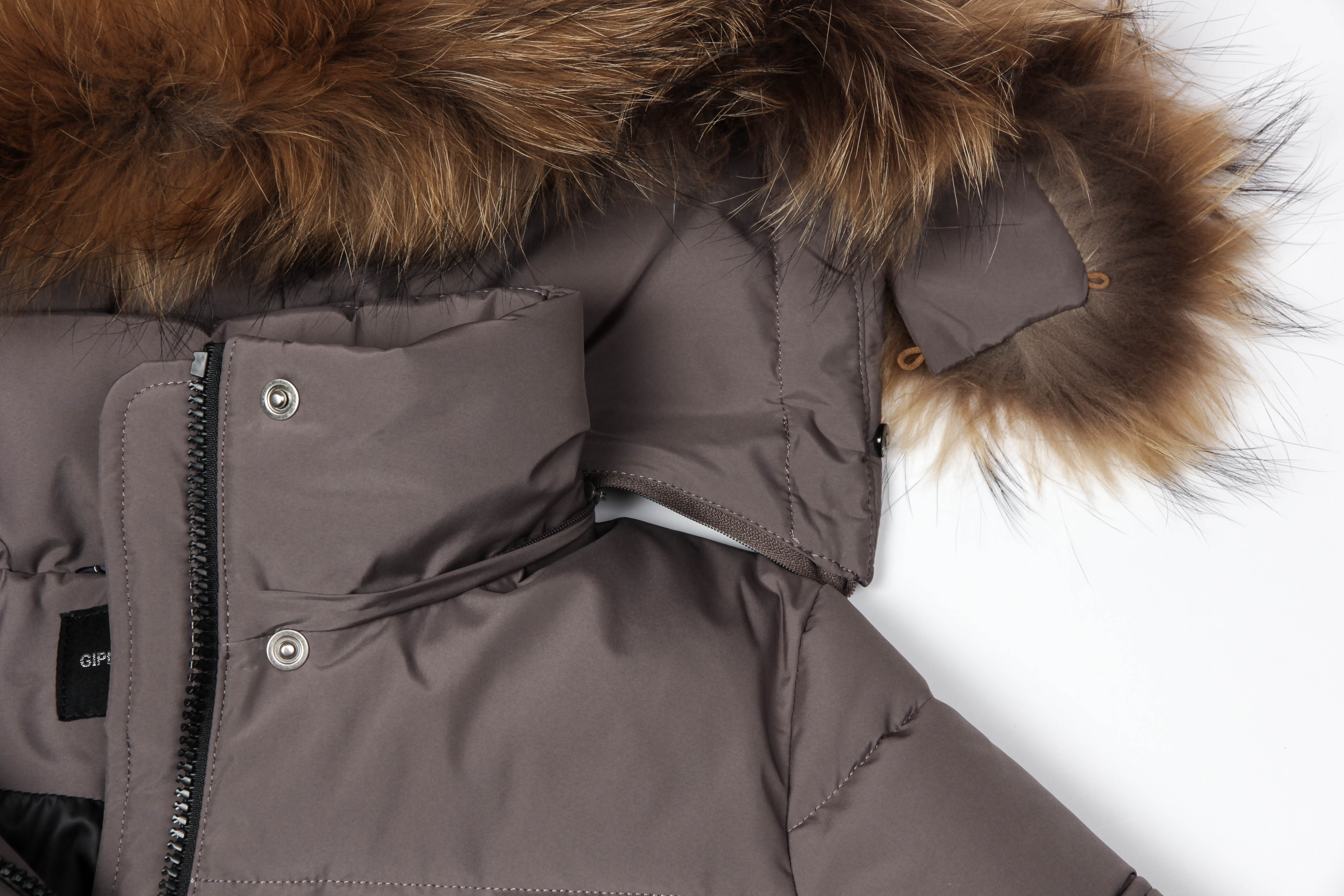 карман на подкладке изделия. Капюшон и мех отстегиваются. Мех – натуральный енот,