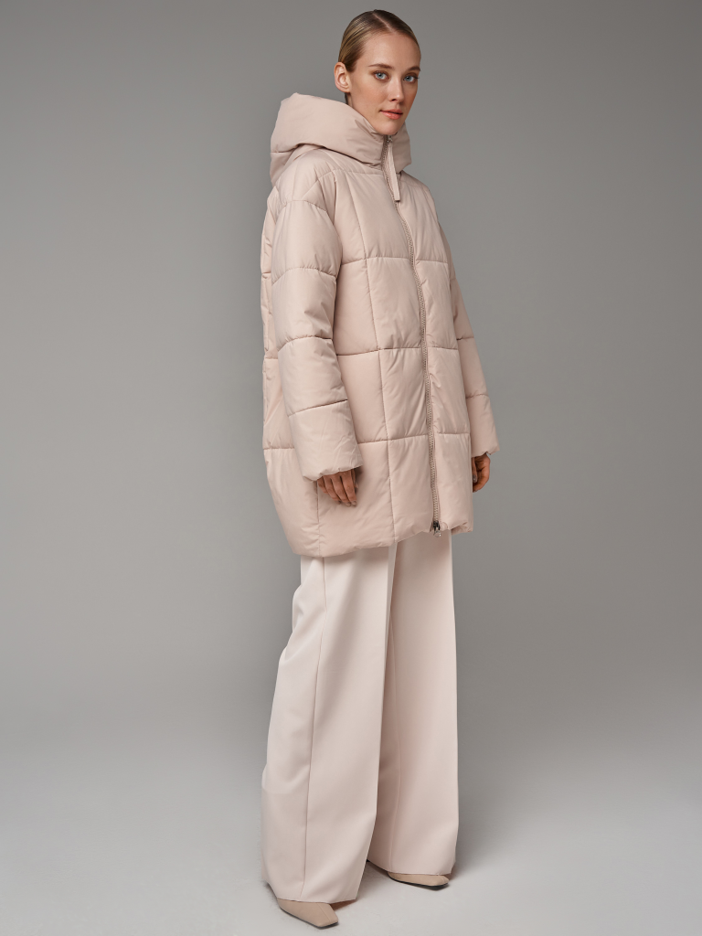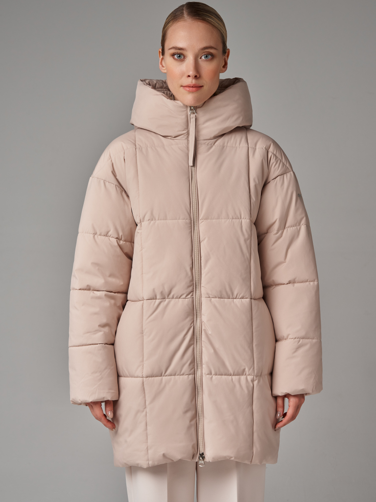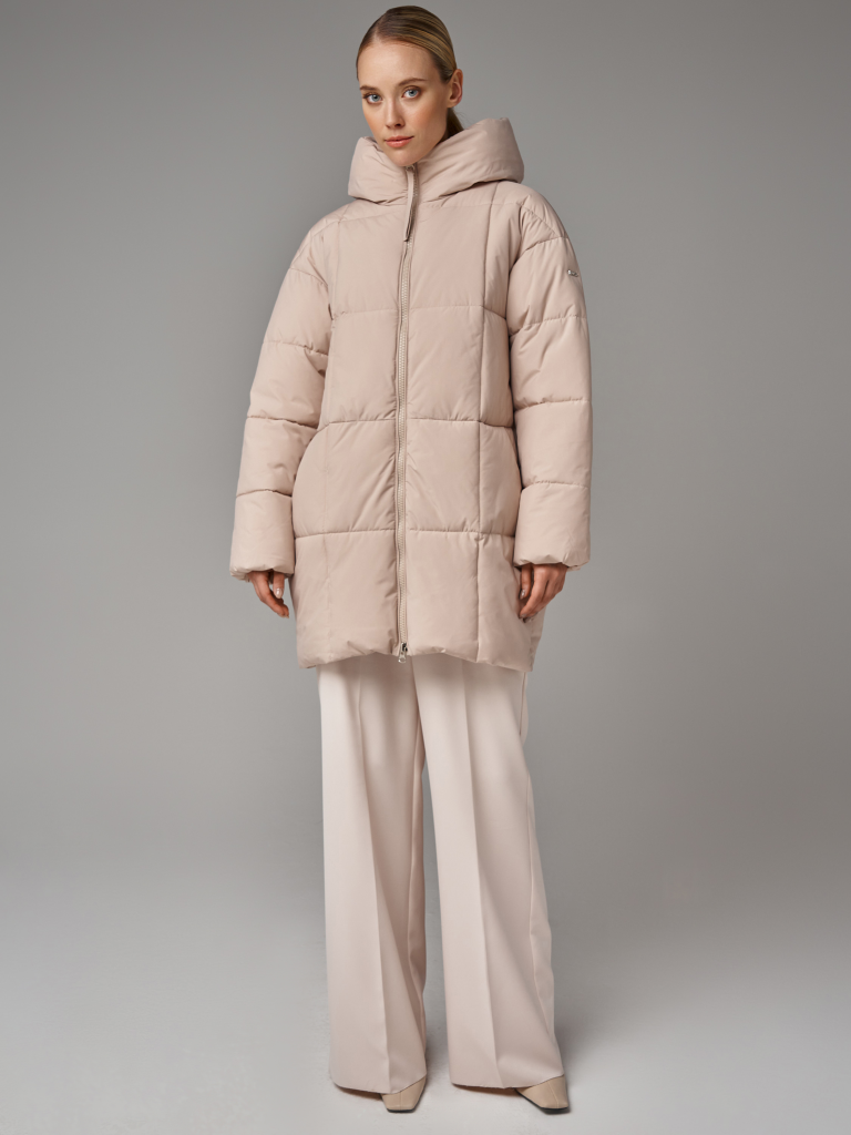 Пуховик силуэта груша со спущенным плечом. В изделии есть капюшон. Застежка на молнию. По низу рукава идет внутренняя ветрозащитная утяжка на резинке. В пуховике есть два функциональных прорезных кармана на магнитах и один внутренний. Ткань - плащевая с водоотталкивающей пропиткой. Утепление Био-пух 220 гр. Рекомендуемый температурный режим (от 0°C до -15°C).