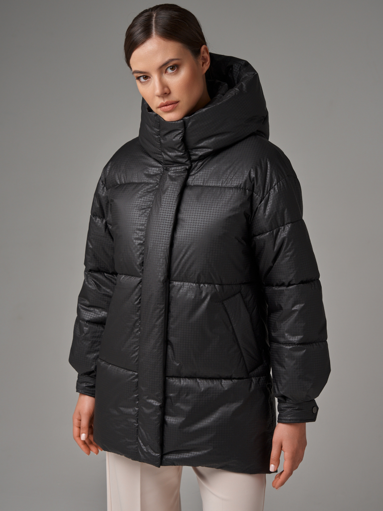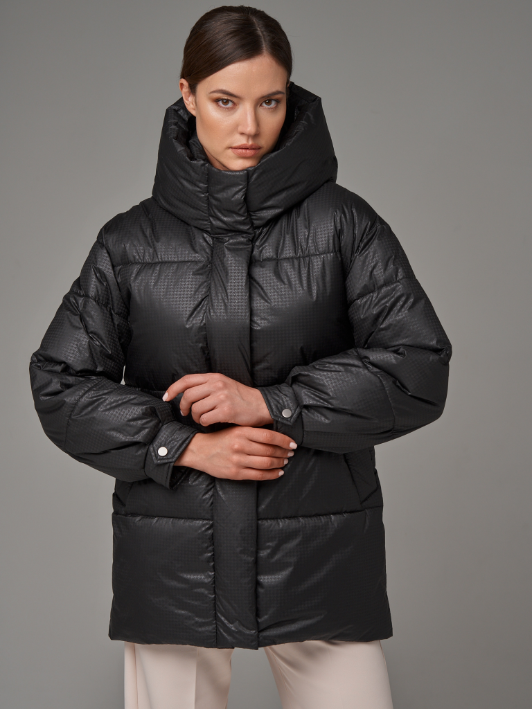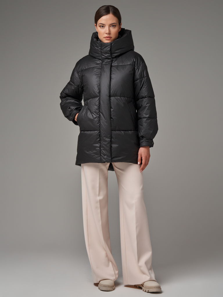 Пуховик oversize силуэта. В изделии есть внутренняя утяжка по низу. Рукав со спущенным плечом. По низу рукавов заложены складки и имеются манжеты с отделочными кнопками. Застежка на молнию, скрытую под планкой на потайных кнопках. В изделии имеются два функциональных кармана с листочками на магнитах и один внутренний карман. Ткань - плащевая с водоотталкивающей пропиткой. Утепление - Био-пух, 200 гр. Рекомендуемый температурный режим (от 0°C до -15°C). Длина изделия - 85 см. Длина рукава - 64 см.