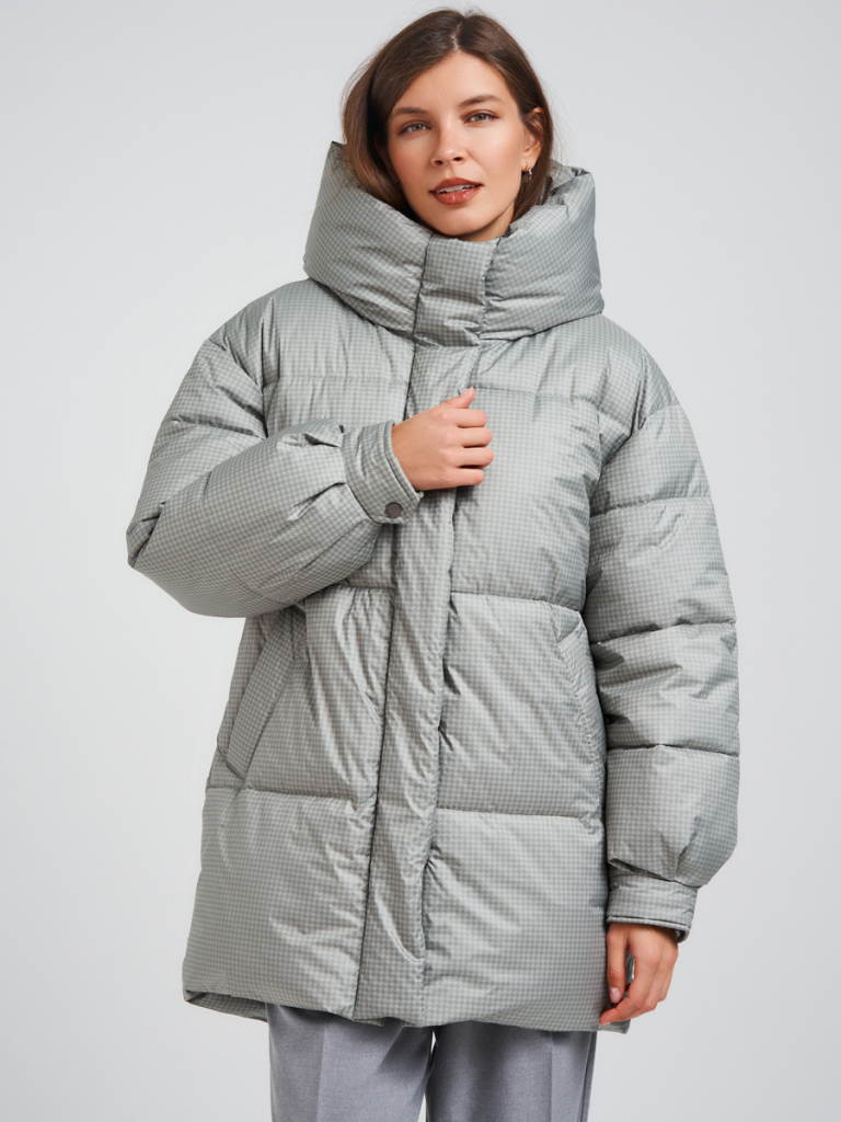 Пуховик oversize силуэта. В изделии есть внутренняя утяжка по низу. Рукав со спущенным плечом. По низу рукавов заложены складки и имеются манжеты с отделочными кнопками. Застежка на молнию, скрытую под планкой на потайных кнопках. В изделии имеются два функциональных кармана с листочками на магнитах и один внутренний карман. Ткань - плащевая с водоотталкивающей пропиткой. Утепление - Био-пух, 200 гр. Рекомендуемый температурный режим (от 0°C до -15°C). Длина изделия - 85 см. Длина рукава - 64 см.
