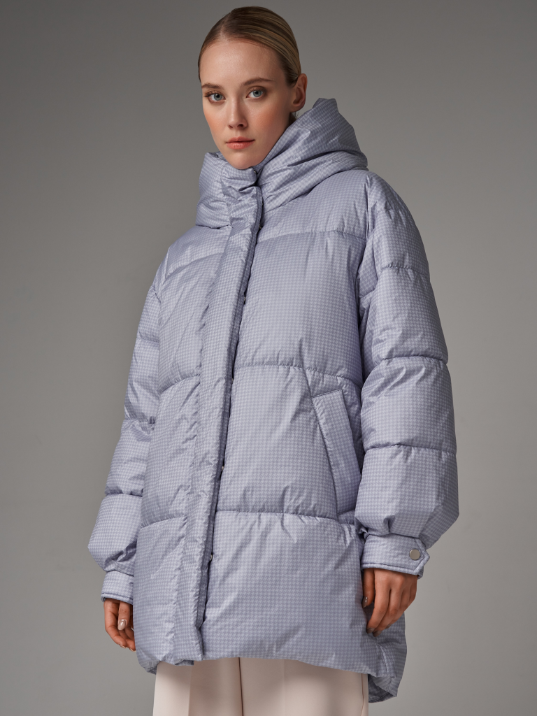 Пуховик oversize силуэта. В изделии есть внутренняя утяжка по низу. Рукав со спущенным плечом. По низу рукавов заложены складки и имеются манжеты с отделочными кнопками. Застежка на молнию, скрытую под планкой на потайных кнопках. В изделии имеются два функциональных кармана с листочками на магнитах и один внутренний карман. Ткань - плащевая с водоотталкивающей пропиткой. Утепление - Био-пух, 200 гр. Рекомендуемый температурный режим (от 0°C до -15°C). Длина изделия - 85 см. Длина рукава - 64 см.