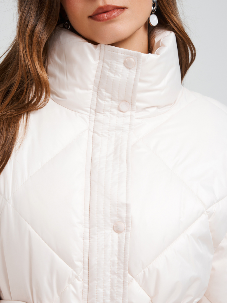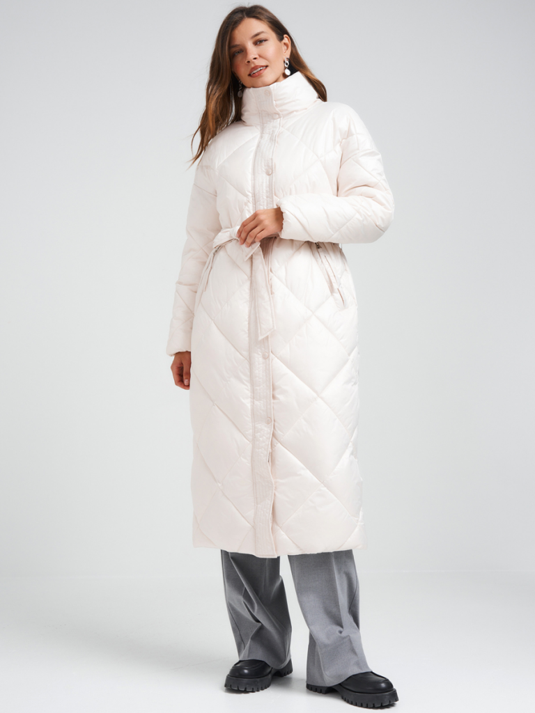 Пуховик прямого силуэта со стойкой на молнии и декоративных кнопках. В изделии два удобных кармана на молниях, а также есть внутренний карман. В комплекте с изделием идет пояс из основной ткани с пряжкой. Ткань - плащевая с водоотталкивающей пропиткой. Утепление – Био-пух, 260 гр. Рекомендуемый температурный режим (от -0°C до -20°C). Длина изделия - 120 см. Длина рукава - 65 см.