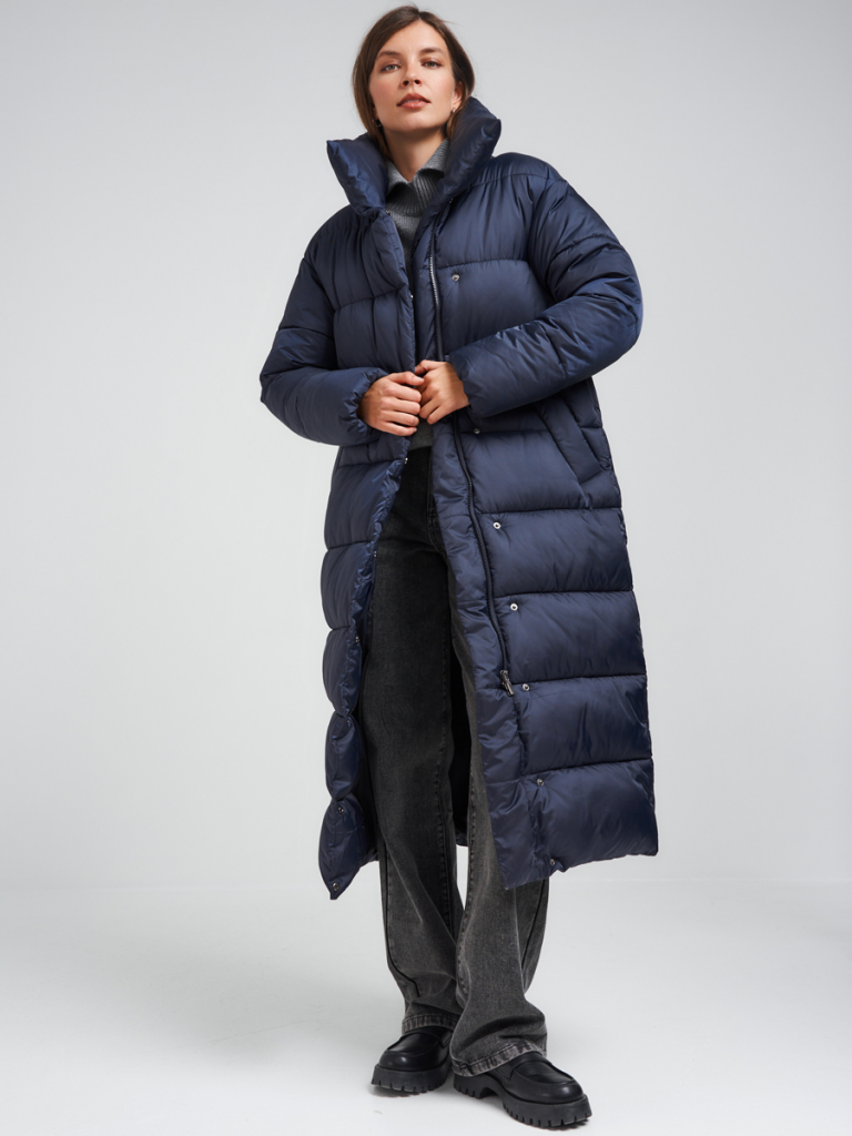 Пуховик прямого силуэта на молнии и потайных кнопках. Рукав со спущенным плечом. По низу рукава идет внутренняя ветрозащитная утяжка на резинке. Горловина изделия оформлена воротником стойкой на магнитных кнопках. В изделии два функциональных удобных кармана оформленные листочками на магнитах. Ткань - плащевая с водоотталкивающей пропиткой. Утепление: Био-пух 250 гр. Рекомендуемый температурный режим (от -5°C до -20°C). Длина изделия -120 см. Длина рукава - 64 см.