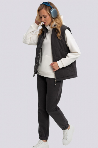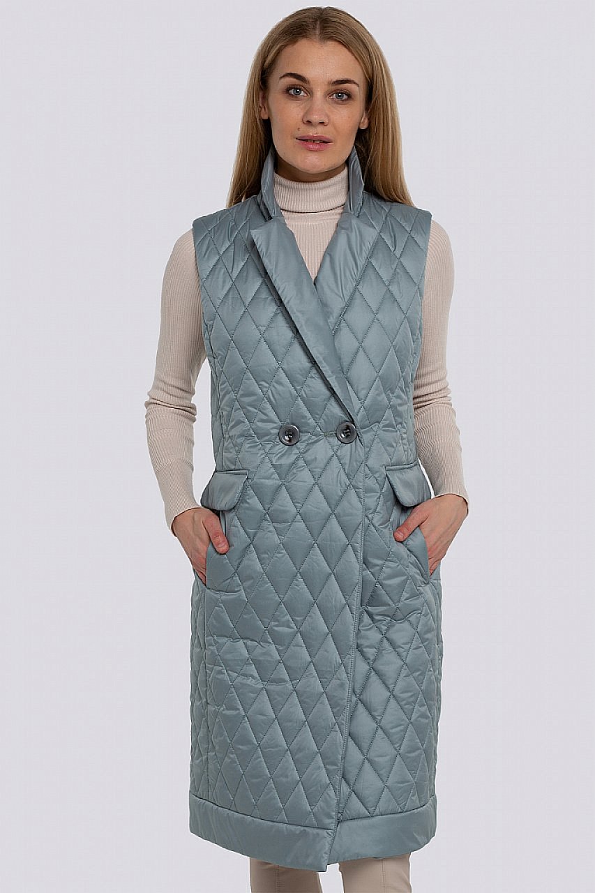 Теплые женские жилеты — не новый тренд, тем не менее его популярность усилилась, благодаря универсальности, практичности этой одежды среди других фасонов. Удлиненный жилет из стеганой ткани смотрится стильно и будет согревать вас в холодную погоду. Жилет прямого силуэта с английским воротником. Застежка двубортная на петли и пуговицы. Спереди карманы в швах и декоративные клапаны. На спинке – декоративный пояс на пуговицах. «Изюминку» в модель вносит сочетание стеганой ткани и деталей из гладкой ткани. Утеплитель термофин, плотность 100. зеленый чай