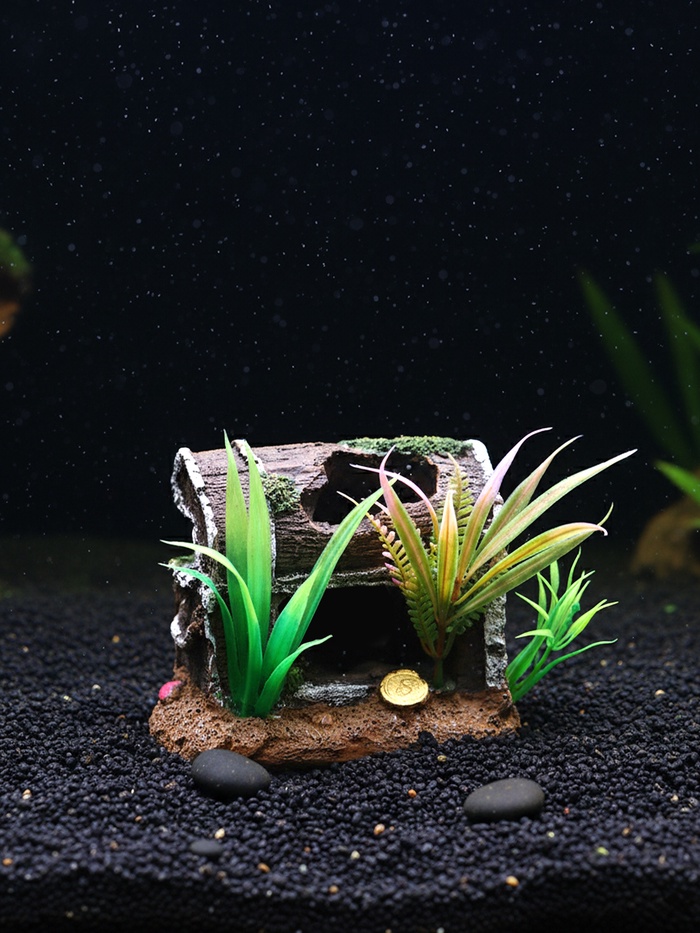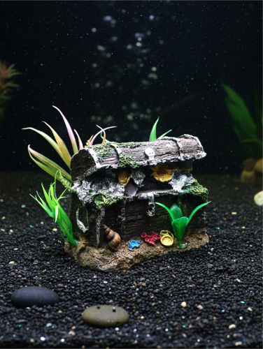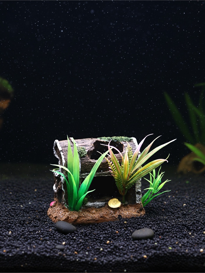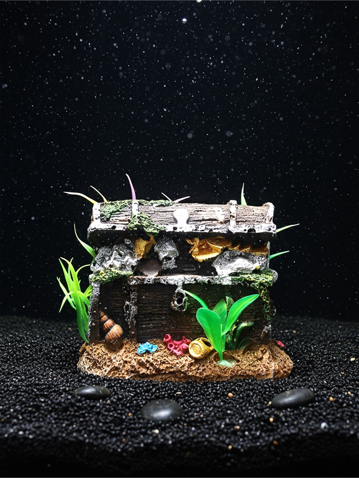 * Форма сундука: Распространённый образ в аквариумистике — символ тайны и исследования. Такой декор естественно вписывается в композицию, особенно если в аквариуме живут активные рыбы, которые любят исследовать укрытия.