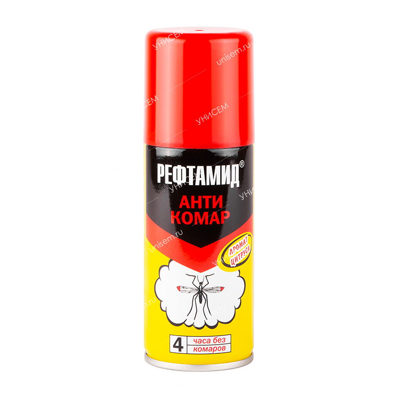 REFTAMID Антикомар– средство репеллентное в виде аэрозоли. Применяется для защиты людей от укусов кровососущих насекомых при нанесении на открытые части тела, одежду, занавески, сетки и другие изделия из ткани в практике медицинской дезинсекции и населением в быту. Препарат отличается мгновенным эффектом и длительным действием (до 4 часов защиты). В качестве действующих веществ используется – N, N-диэтил-м-толуамид (15,75%), диметилфлатат (13,5%), а также в состав входит спирт этиловый, вспомогательные компоненты, отдушка и пропеллент углеводородный.• Хранить отдельно от лекарств, пищевых продуктов и кормов для животных в сухом, прохладном месте, недоступном для детей и животных.