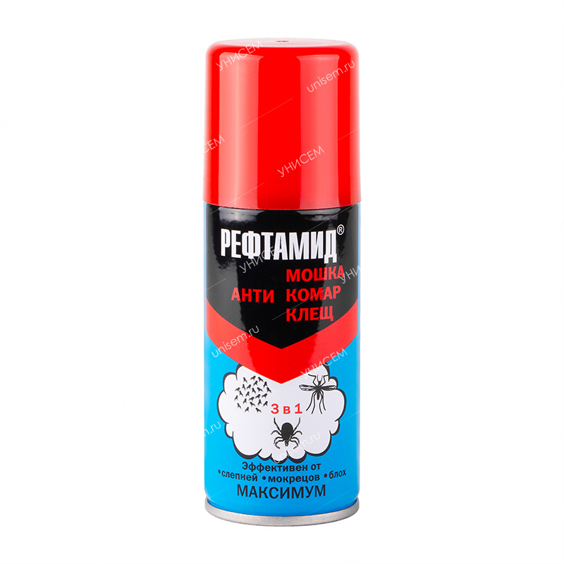 REFTAMID Максимум Антимошка, комар, клещ– средство акарицидно-репеллентное в виде аэрозоли. Применяется для защиты взрослых людей от укусов кровососущих насекомых при нанесении на открытые части тела, одежду и другие изделия из ткани. Препарат отличается мгновенным эффектом и длительным действием (до 4 часов защиты). В качестве действующих веществ используется – N, N-диэтил-м-толуамид (28%), а также в состав входит спирт этиловый, бутан/пропан/изобутан, пропиленгликоль и отдушка.• Хранить отдельно от лекарств, пищевых продуктов и кормов для животных в сухом, прохладном месте, недоступном для детей и животных.