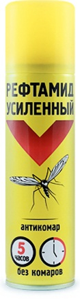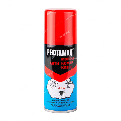 REFTAMID Усиленный Антиклещ– средство инсектоакарицидное в виде аэрозоли. Применяется для защиты взрослых и детей с 3-х лет от таежных и лесных клещей, блох при обработке одежды и других изделий из ткани. В качестве действующих веществ используются – альфациперметрин (0,2%), имипротрин (0,15%). При попадании клеща на обработанную поверхность, он получает сильную дозу и уже через 2 минуты его парализует, через 5 минут он отпадает от поверхности и погибает. Время защитного действия от клещей и блох – до 15 суток.• Хранить отдельно от лекарств, пищевых продуктов и кормов для животных в сухом, прохладном месте, недоступном для детей и животных.
