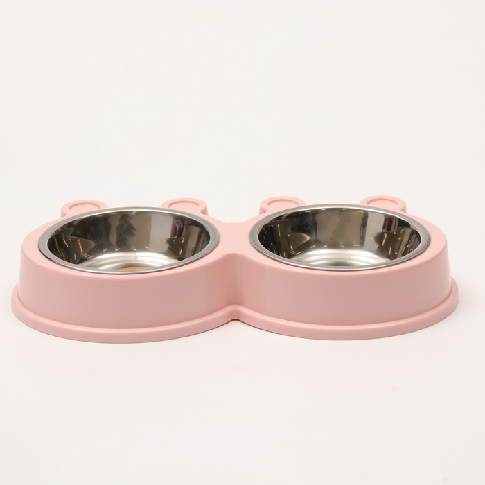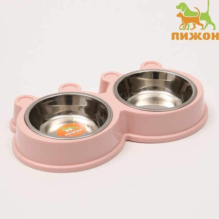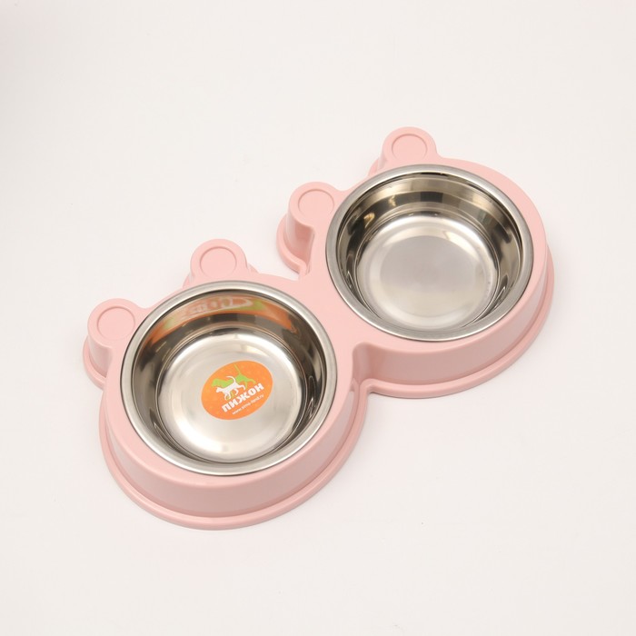 Миска имеет две чаши, выполненные из металла, которые установлены на пластиковой подставке.