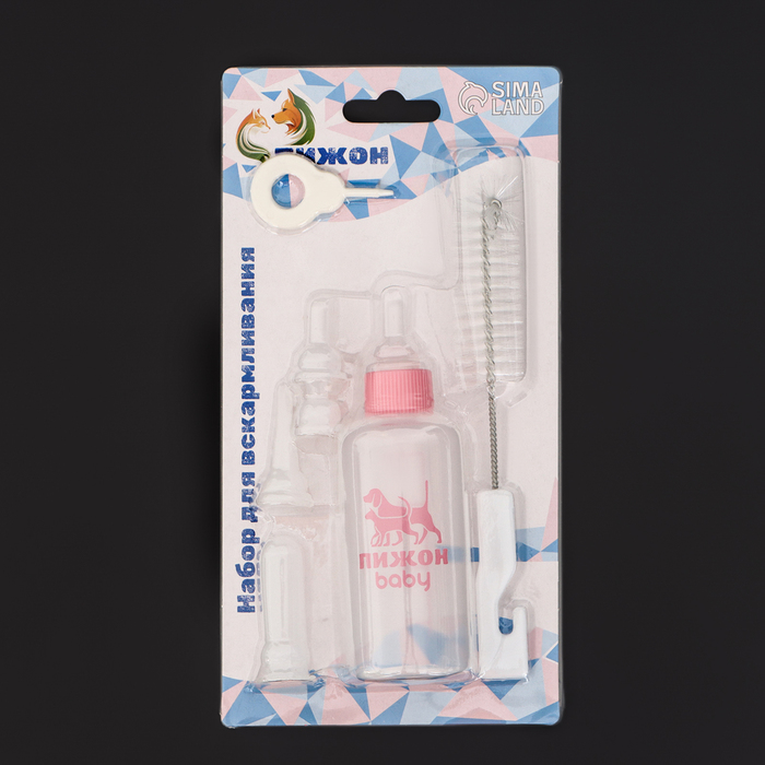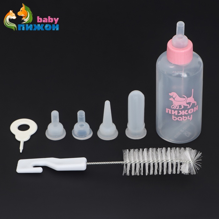 Набор для вскармливания щенков, котят и грызунов ПИЖОН. В комплекте содержится: 1 бутылочка объемом 60 мл, 4 соски, 2 короткие длиной 2 см, 1 длиная с тонким носиком 3 см, 1 длиная с толстым носиком 4 см, 1 ершик-щётка для мытья бутылочки.Показания к применению: для искусственного вскармливания новорожденных и подрастающих щенков, котят и других животных, а также для кормления больных и выздоравливающих животных. Способ применения: кончик резиновой соски проткните иглой или отрежьте верхушку ножницами. Будьте осторожны, потому что из-за слишком большого отверстия в соске животное может подавиться. После каждого использования, тщательно помойте бутылочку и соску.