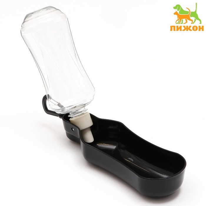 Бутылка для собак проста в использовании. Бутылка для собак откручивается от лотка, наполняется водой, затем снова прикручивается. Далее для поступления необходимого количества воды нужно нажать на бутылку и вода поступит в контейнер для питья собаки. В вертикальном положении поилка не протекает.
