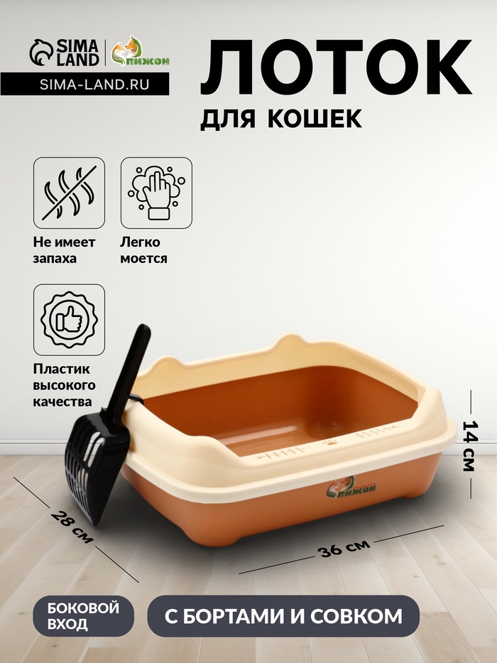 Лоток, в который легко заходить и удобно пользоваться — с бортом, совком и продуманной формой. Кошачий туалет с боковым входом выполнен в нейтральном коричневом цвете и подходит для кошек средних пород. Прямоугольная форма 36×28 см и высокие борта 14 см надёжно удерживают наполнитель внутри, а в комплекте идёт совок для быстрой уборки.
