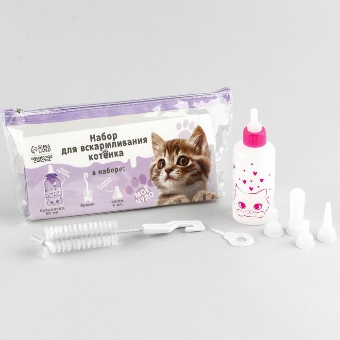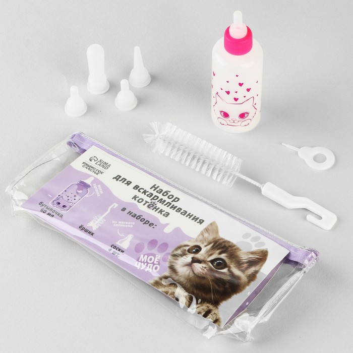 Набор предназначен для искусственного вскармливания новорождённых котят, может применяться для кормления больных животных. Перед началом использования соску необходимо проткнуть специальной пластиковой иголкой, которая есть в комплекте.