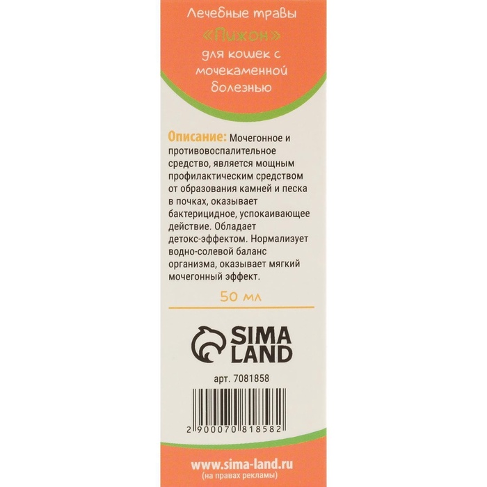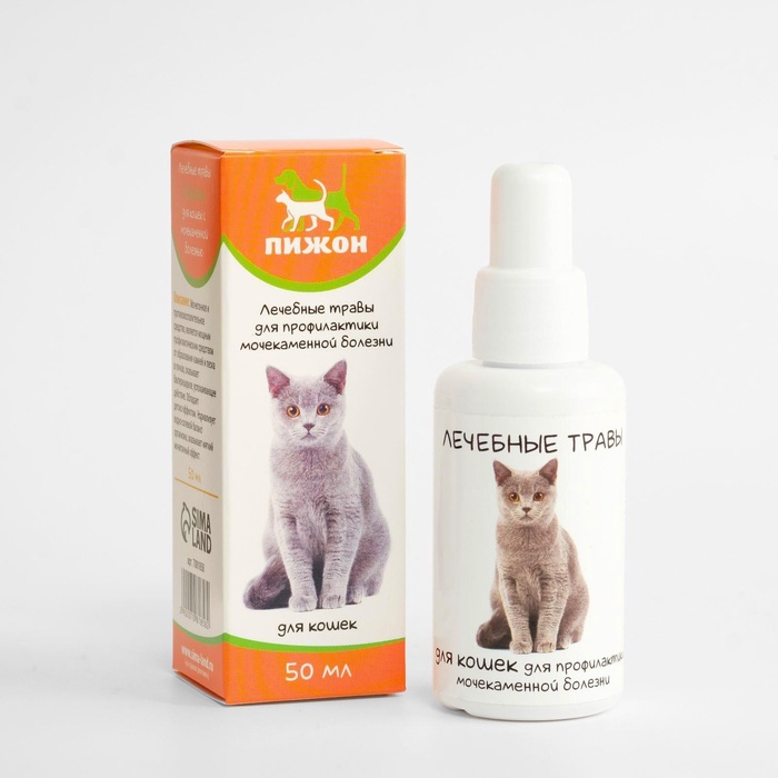 Лечебные травы "Пижон" для кошек с мочекаменной болезнью, 50 млМочегонное и противовоспалительное средство, является мощным профилактическим средством от образования камней и песка в почках, оказывает бактерицидное, успокаивающее действие, обладает детокс-эффектом. Нормализует водно-солевой баланс организма, оказывает мягкий мочегонный эффект.Состав: вода, фукус пузырчатый, спорыш, корень одуванчика, кукурузные рыльца, лист брусники, валерьяна, сорбиновая кислота.На каждые 5 кг веса животного 1 чайная ложка средства 2-3 раза в день в корм животного в течение месяца. 3-4 раза в год.