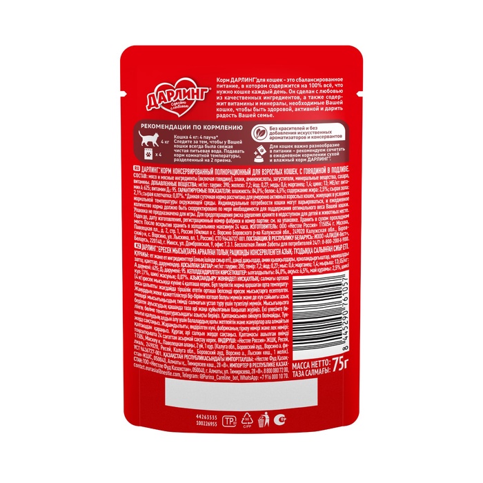 ШБ Влажный корм DARLING для кошек, говядина в подливе, 26х75г