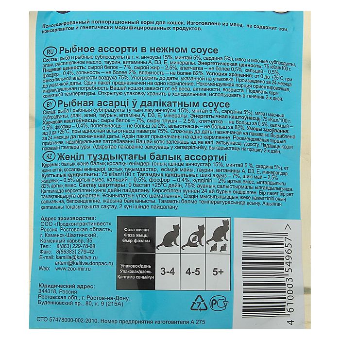 Влажный корм "Puffins" для кошек, сочные кусочки рыбное ассорти в соусе, 100 г