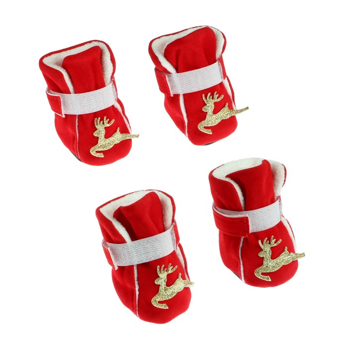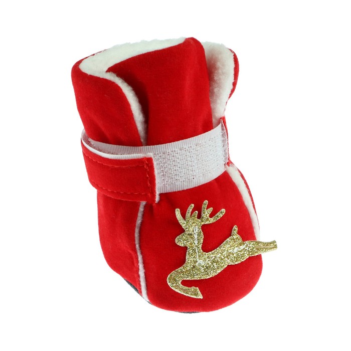 Новогодние и стильные ботинки для маленьких собак, изготовлены из синтетического материала с водоотталкивающей пропиткой. Подкладка выполнена из мягкого искусственного меха. Подошва изготовлена из ЭВА это очень легкий, гибкий и износостойкий материал с прекрасной амортизацией. Рекомендации по уходу: Если ботинки не очень грязные, уберите загрязнения сверху с помощью влажной губки или салфетки, либо просто промойте водой. Допускается стирка при температуре не выше 40 градусов, однако следует учитывать, что при каждой стирке смывается часть пропитки и свойства ткани ухудшаются.