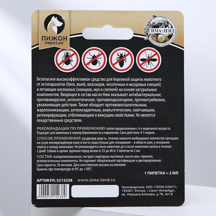 БИО капли от паразитов для животных "Пижон Premium" для щенков и собак крупных пород, 25-40кг, 2 х2м