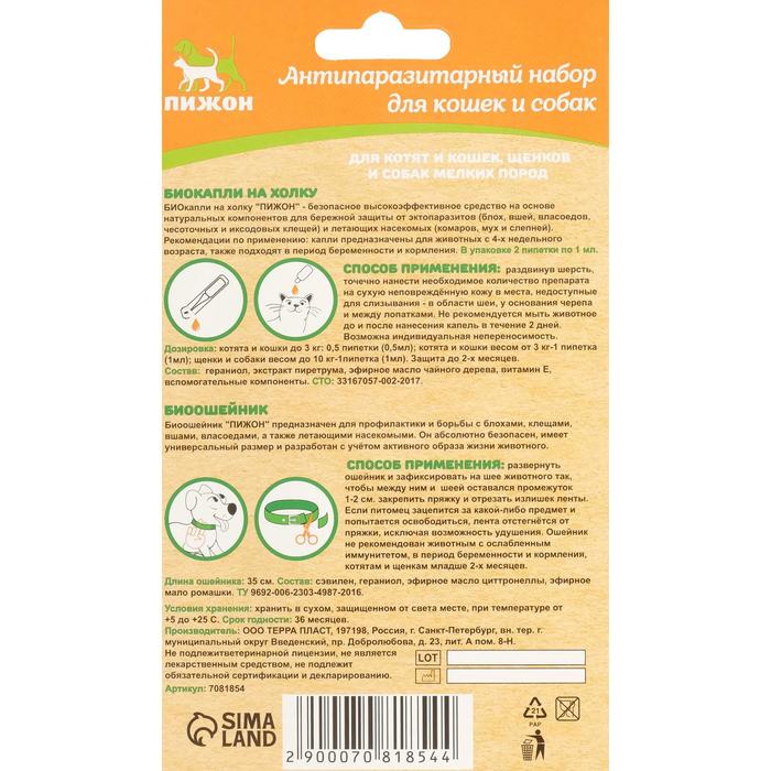 Набор от паразитов "Пижон" для кошек и собак (ошейник 35 см + биокапли 2х1 мл)