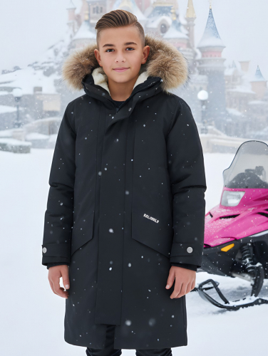 Парка зимняя подростковая для мальчика с капюшоном и мехом черного цвета 9537Ch
