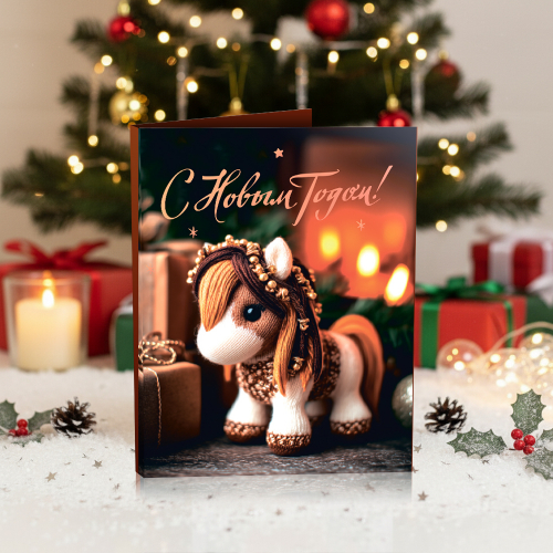 ★︎ Мини-открытка "С Новым годом (лошадка у камина)"