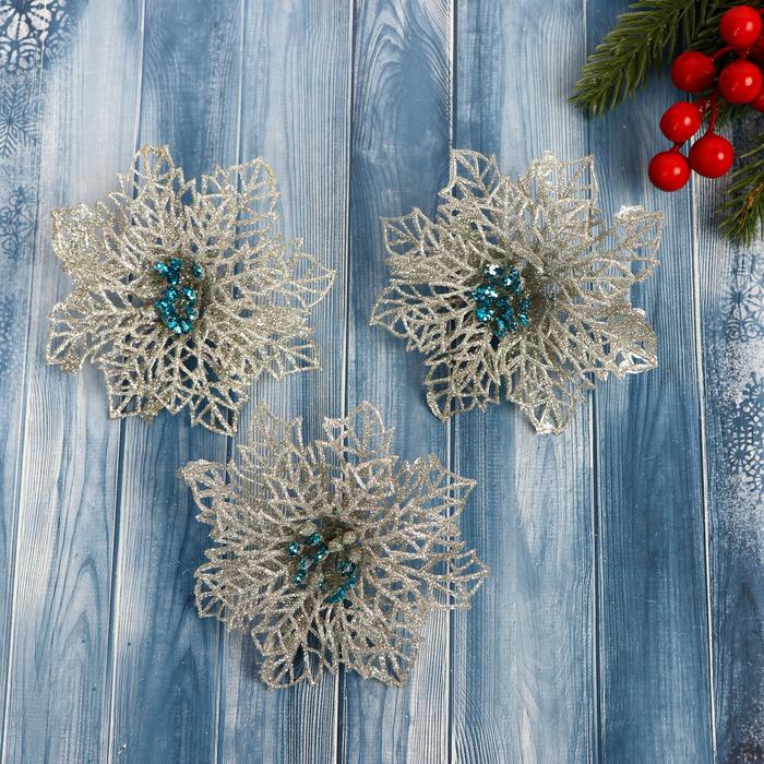 Ёлочные игрушки 3 шт. «Зимнее волшебство. Ажурный цветок» пластик, 10.5 см, серебро
