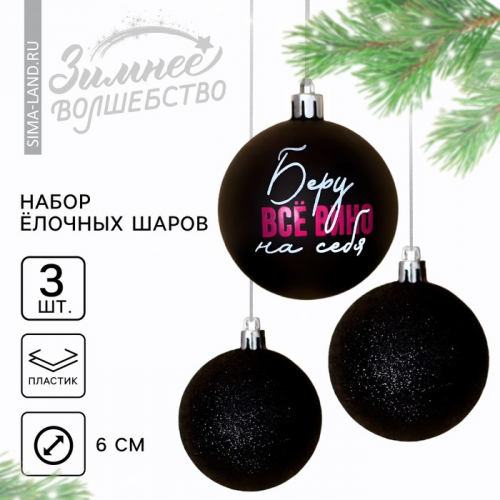 Шары ёлочные новогодние «Беру все вино на себя», пластик, d=6, 3 шт., чёрные