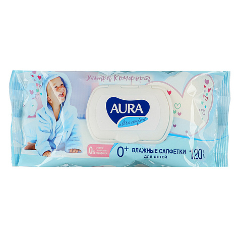 Влажные салфетки детские AURA ULTRA COMFORT с экстрактом алоэ и витамином Е, с крышкой, 120 шт