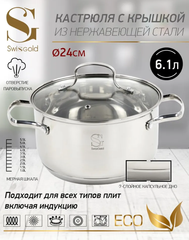 АКЦИЯ 1356р. 2100р.18078-1 Кастрюля с крышкой 6,1 л нерж/сталь "Swisgold" (х6)
