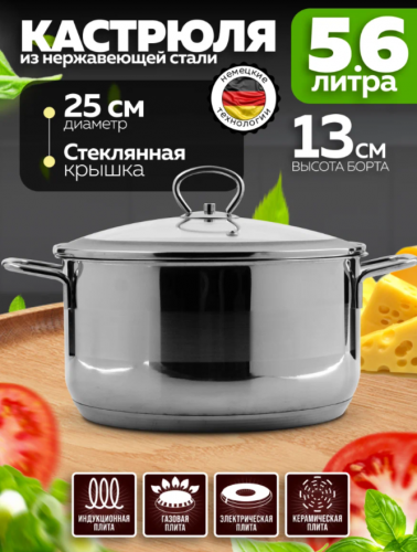 АКЦИЯ 1403р. 2300р.2139-1 Кастрюля со стеклянной крышкой 24см, 5,6л нерж/сталь (х4)