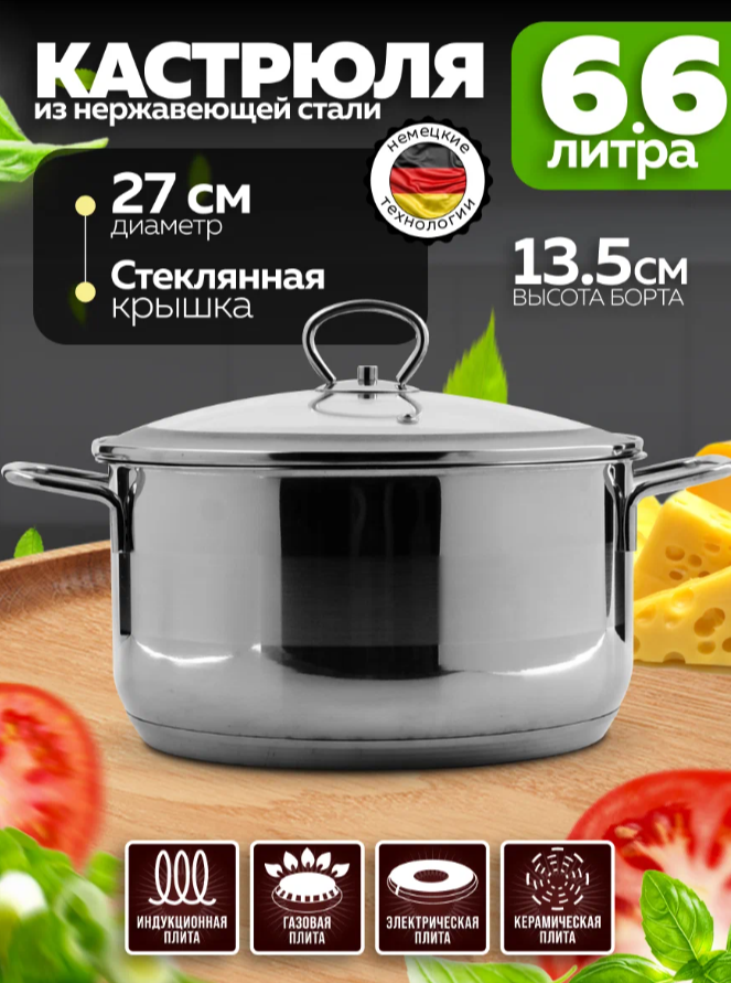 АКЦИЯ 1450р. 2300р.2010-1 Кастрюля со стеклянной крышкой, 26см, 6,6л, нерж/сталь (х6)