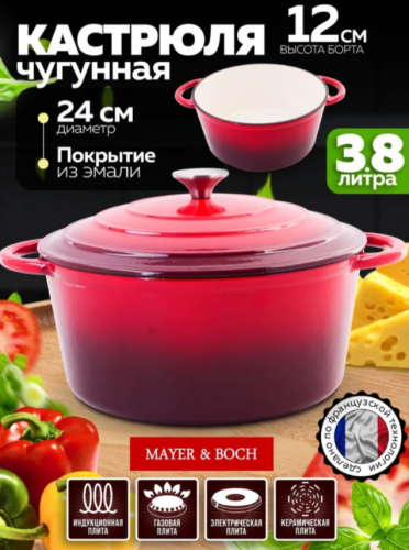 АКЦИЯ 2816р. 4500р.40621 Кастрюля чугун 3,8 л эмаль/покрытие красная MB (х2)