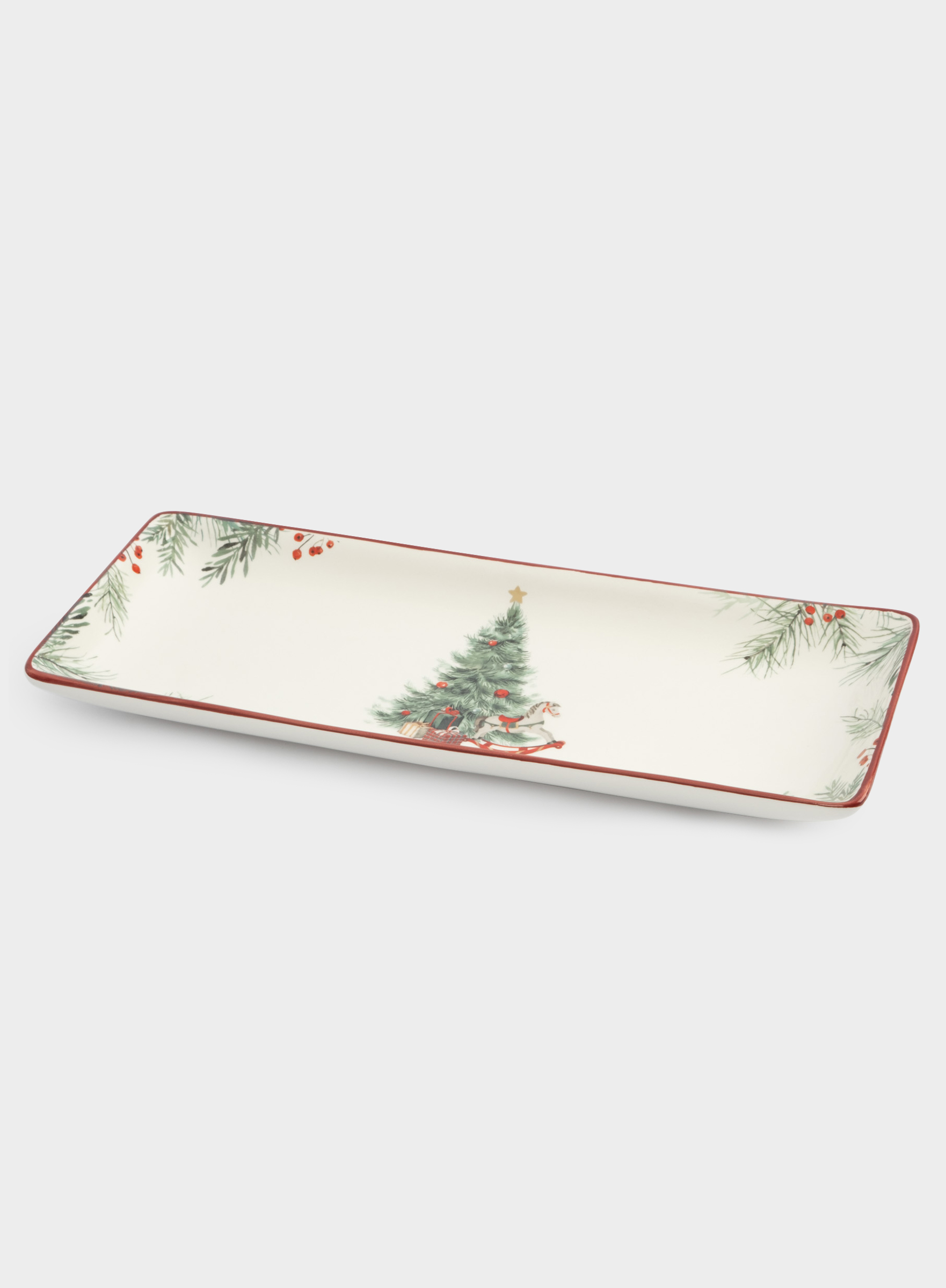 Блюдо, 34х13 см, доломитовая керамика, прямоугольное, красная, Лошадка у елки, Festival