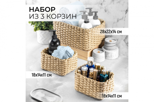 Набор 3 плетеных корзин 1 корзинка 28*22*14 см, 2 корзинки 18*14*11 см, соломенный