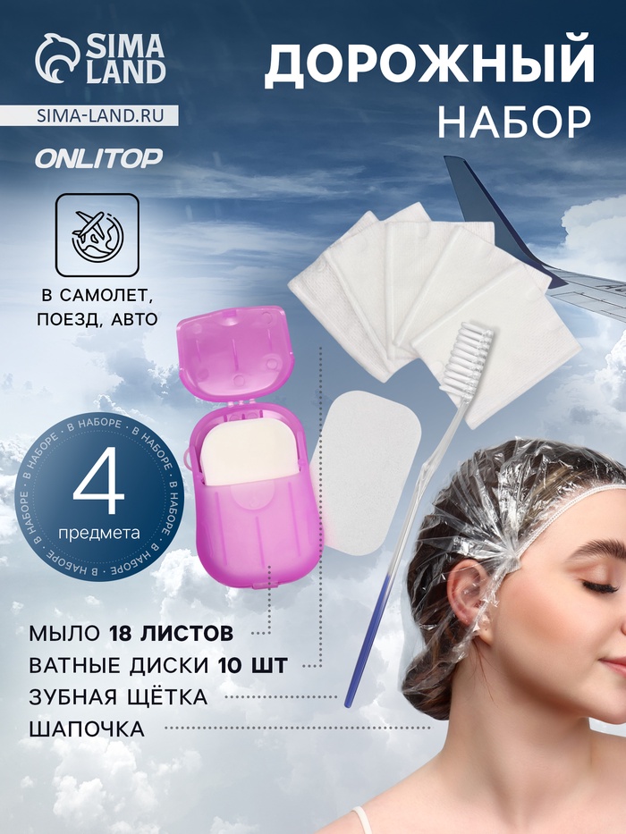 Дорожный набор, 4 предмета, шапочка, щётка, мыло 18 (± 2) листов, ватные диски 10 штук