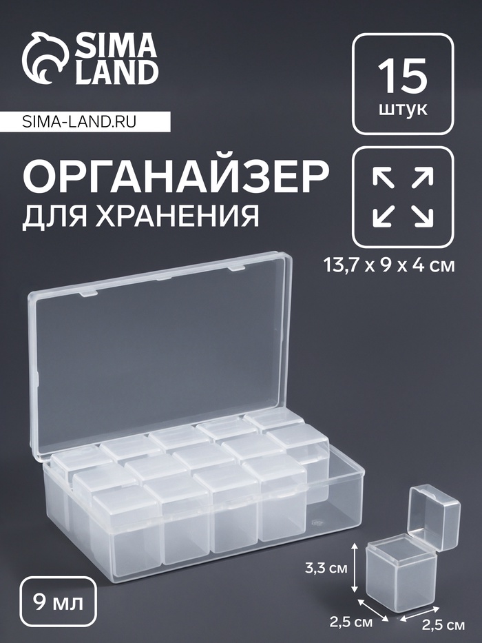 Органайзер для хранения мелочей, 15 баночек, 9 мл, 13.7×9×4 см, прозрачный