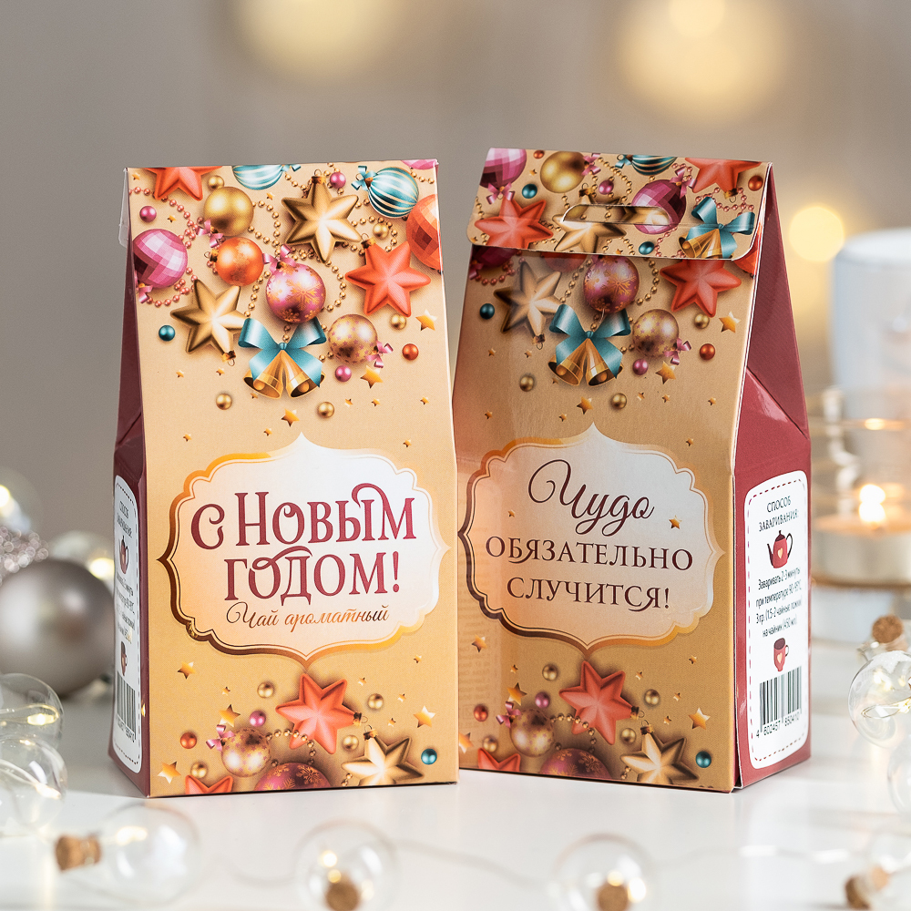 Подарочный чай-домик "С Новым годом (новогодние игрушки на золотом)"