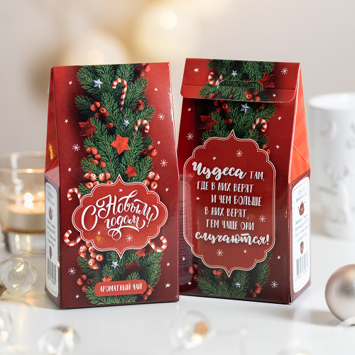 Подарочный чай-домик "С новым годом (красный с еловыми веточками)"