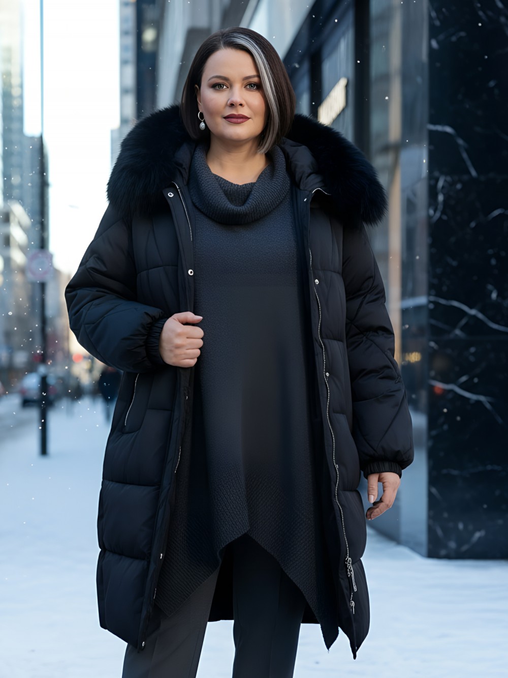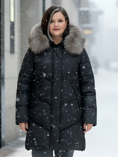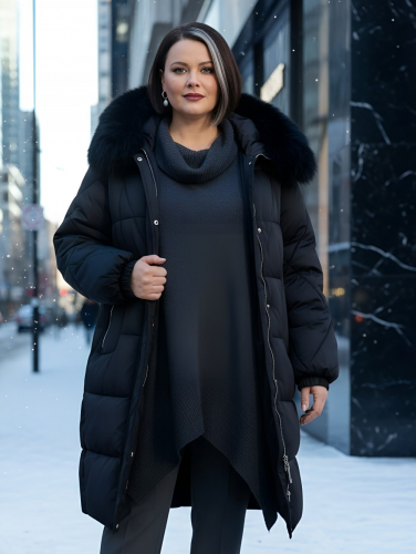 Пальто зимнее утепленное с мехом и капюшоном тренд черного цвета 7629Ch