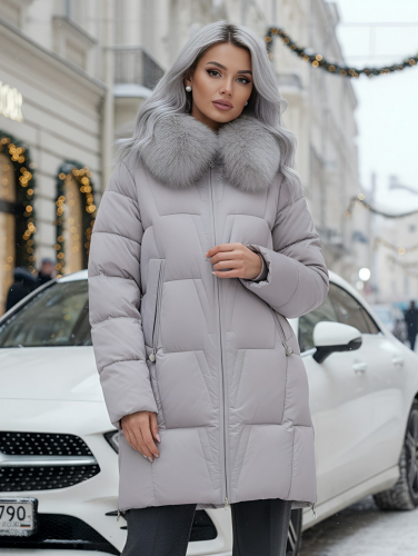 Двубортное пальто зимнее утепленное с мехом и капюшоном темно-серого цвета 7626TC