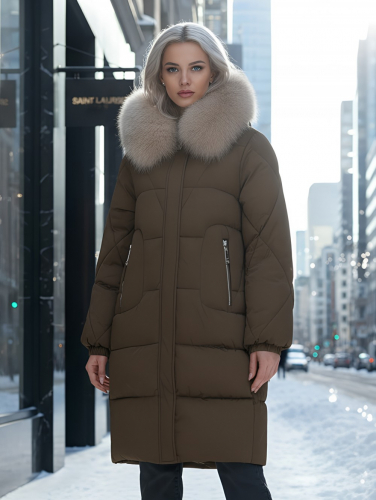Пальто зимнее утепленное с мехом и капюшоном тренд коричневого цвета 7629K