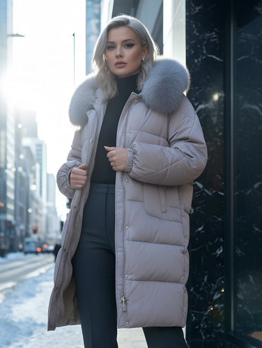Пальто зимнее утепленное с мехом и капюшоном тренд светло-коричневого цвета 7630SK