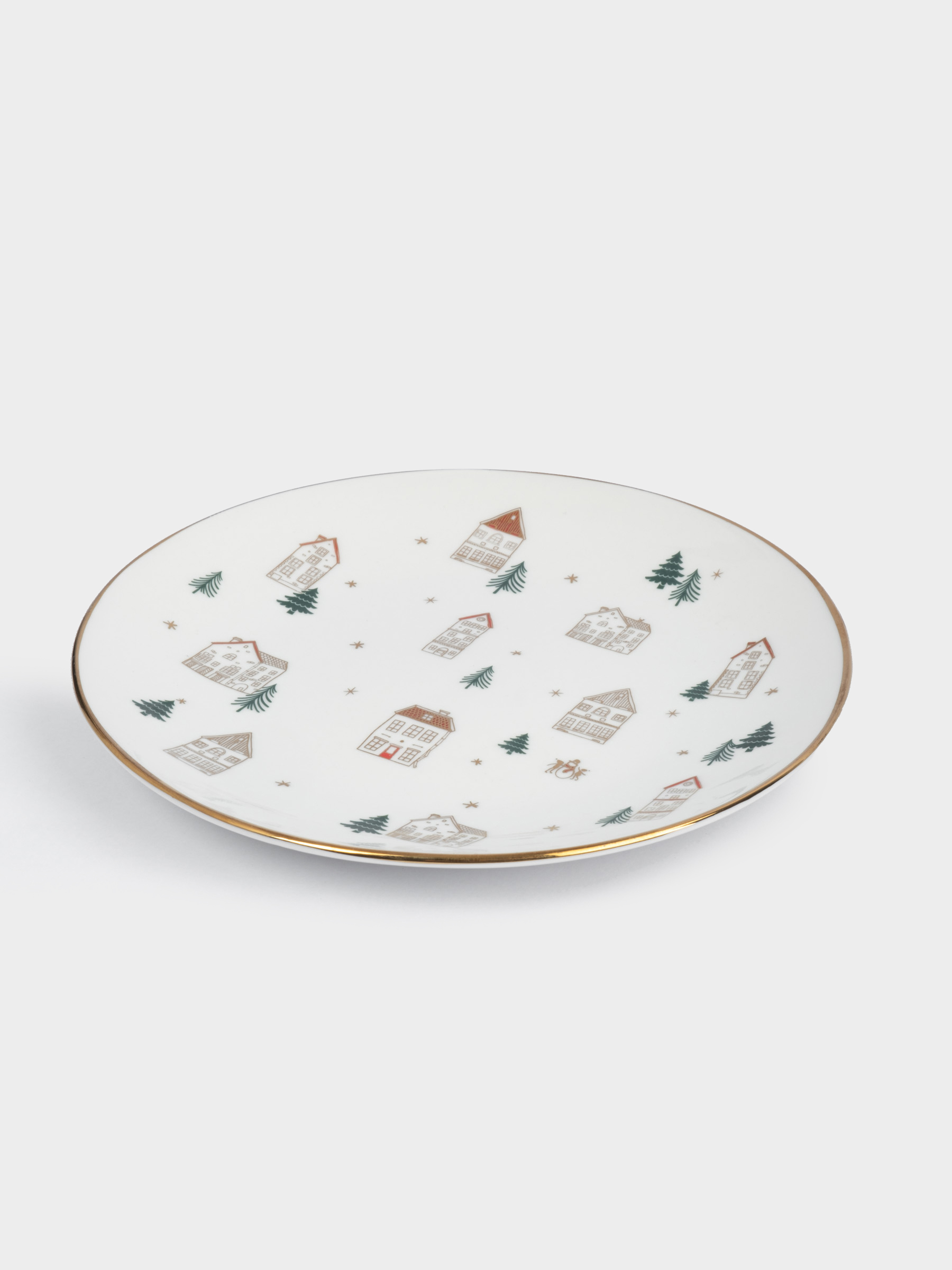 Тарелка закусочная, 19 см, фарфор N, бело-золотистая, Домики и ели, Townlet
