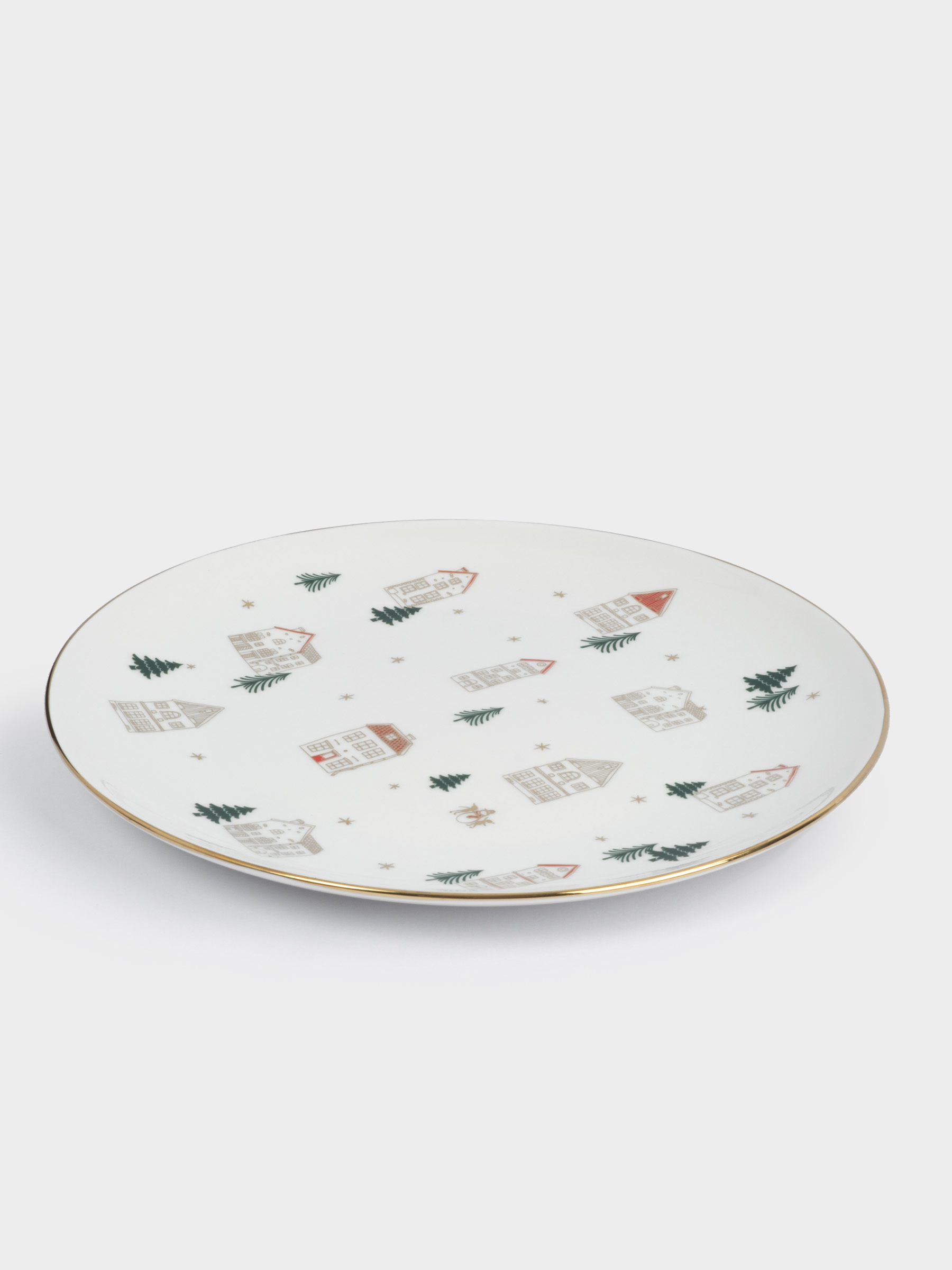 Тарелка обеденная, 27 см, фарфор N, бело-золотистая, Домики и ели, Townlet