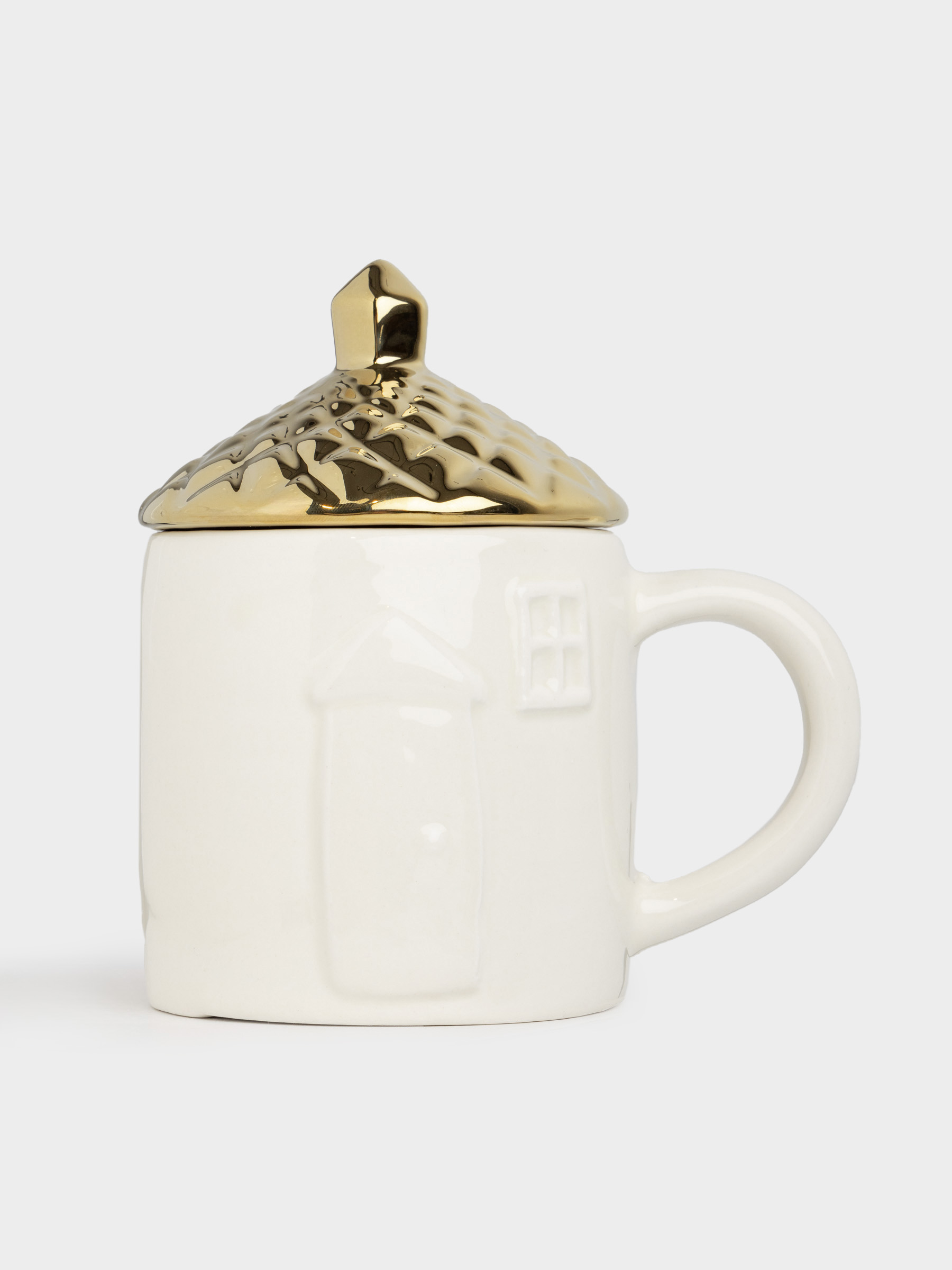 Кружка, 400 мл, с крышкой, керамика, молочно-золотистая, Дом, Townlet