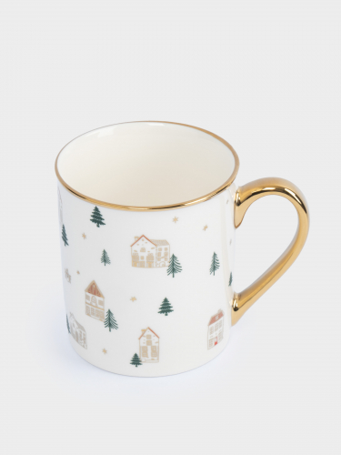 Кружка, 300 мл, фарфор N, бело-золотистая, Домики и ели, Townlet