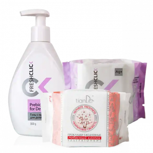 АКЦИЯ! 2=3 Купи 2 средства FreshClick: гель с пребиотиком для деликатного ухода + прокладки с серебром ежедневные cупертонкие – В ПОДАРОК прокладки женские ультратонкие «Небесный хлопок»!