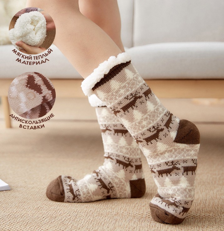 Утепленные домашние носки с силиконовыми вставками (Размер 36-41) С оленями КОРИЧНЕВЫЕ