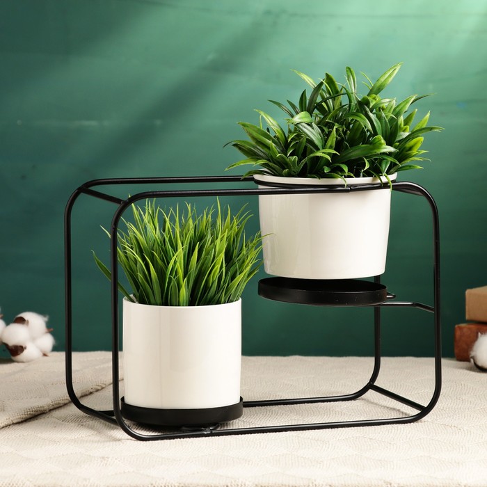Набор горшков для цветов, 2 шт., 420 / 500 мл, 27×12×19 см, керамика, белые, на чёрной металлической подставке