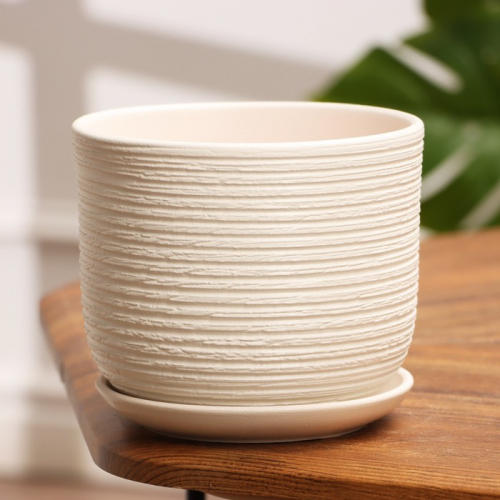 Горшок для цветов «Степь», керамический, с поддоном, 5 л, белый с бежевой полосой